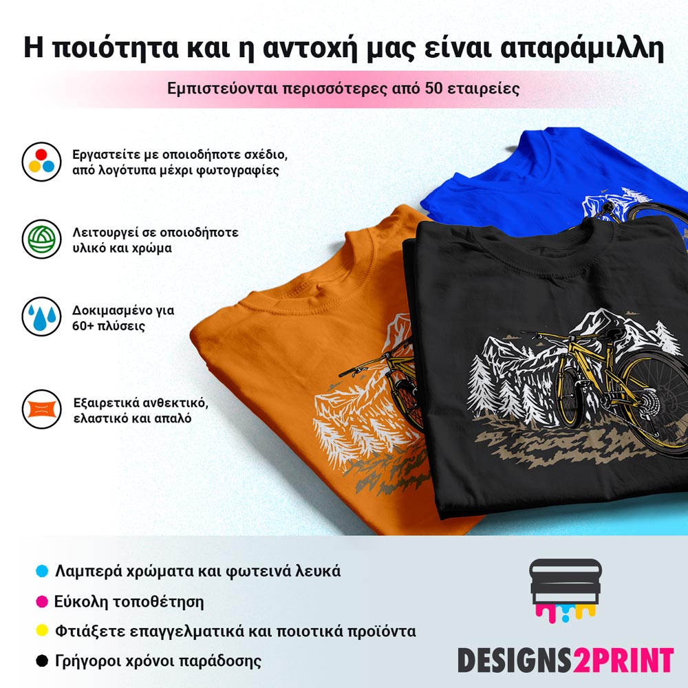 Τυπωμένο με μελάνια, φιλμ και σκόνη TPU υψηλής ποιότητας για να σας δώσει τα πιο λαμπερά λευκά και ζωντανά χρώματα σε κάθε τύπο, υλικό, χρώμα ή ελαστικότητα ρούχου.